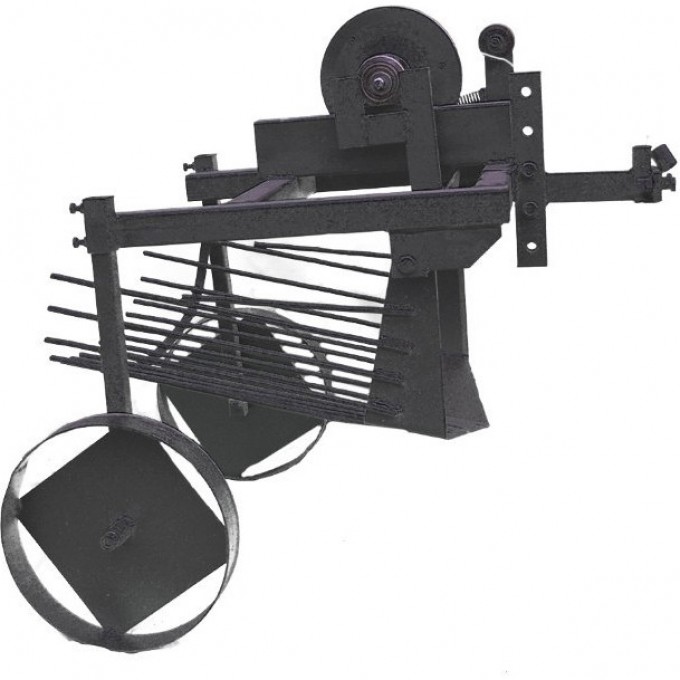 В конструкцию вибрационной картофелекопалки для HUTER МК-7000, МК-7500 входят сцепное устройство, нож с корзиной, прутья, шкивы ременной передачи к культиватору и натяжителя ремня, а также узлы регулировки высоты, т.е. глубины обработки. Ширина захвата составляет 850 мм. Глубина подкапывания – более 25 мм. Ширина обработки почвы при проходе – 400 мм. Рабочая скорость зависит от вида и состояния почвы и составляет 1-1.2 км/ч.